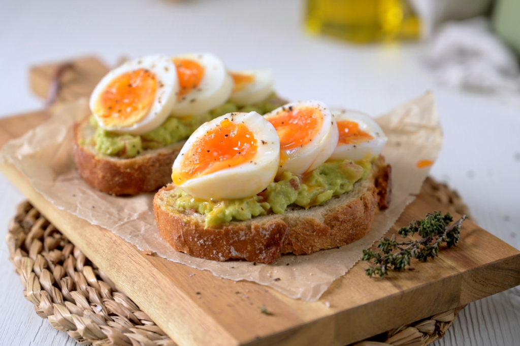 - Spread mashed avocado onto toast. Place egg halves on top.